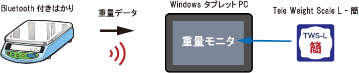 ワイヤレスでモニタする方法としては、Bluetooth付きのはかりと、モニタ用のソフトがインストール