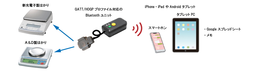 それが、ご紹介するGATT/HOGPプロファイル対応のBluetoothユニット付きはかりを使えばできます。